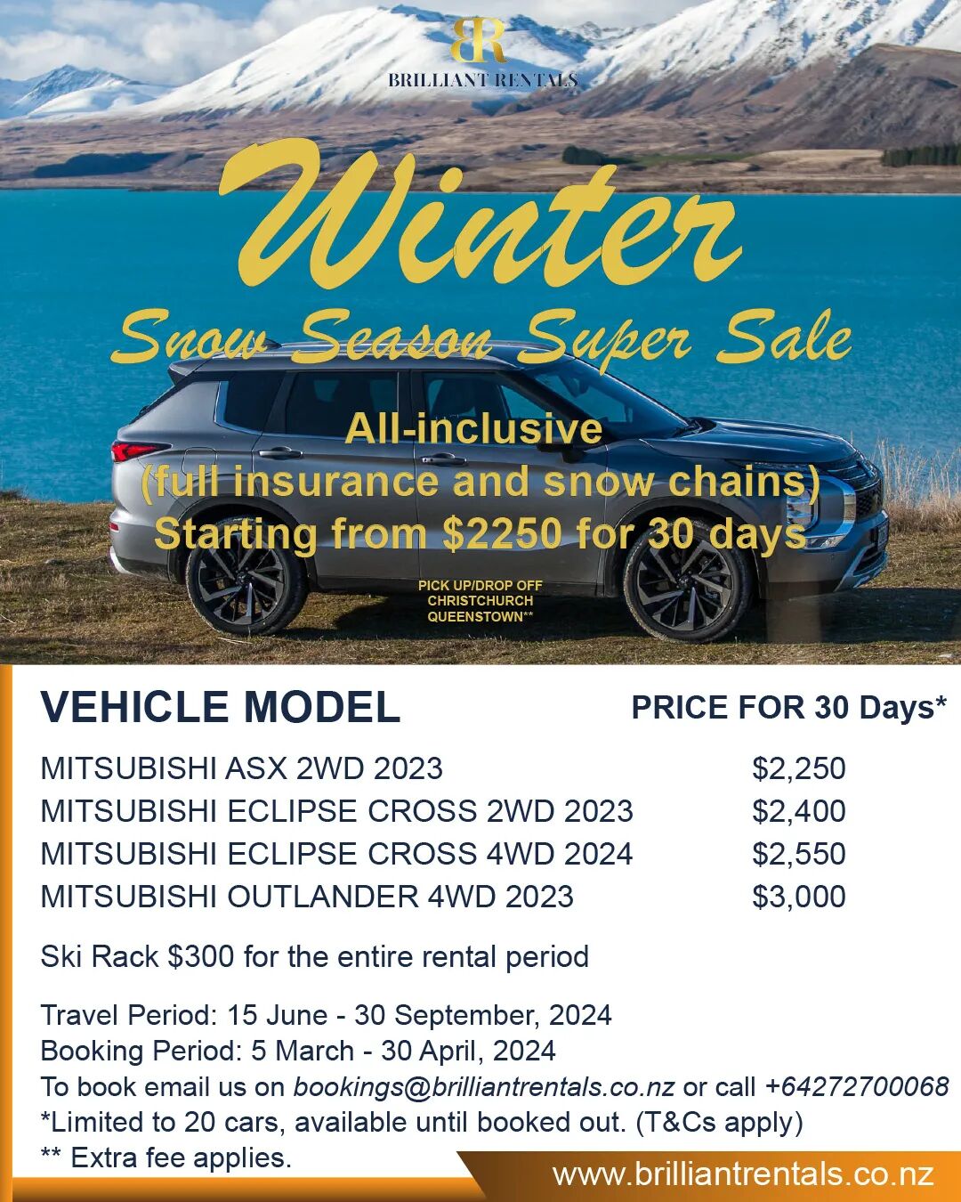 当然,除了滑雪有早鸟特价,在基督城的华人车行---新西兰比邻租车(Brilliant Rentals)也有雪季租车也有超级福利!