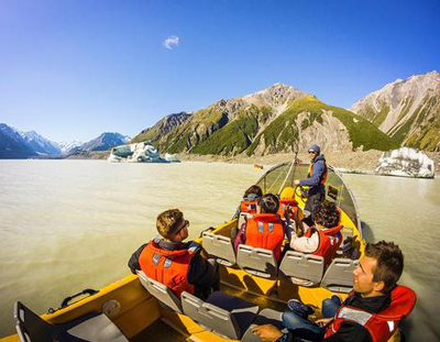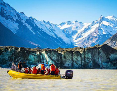 库克山顶峰终年被冰雪覆盖,群山谷地里的冰川-Tasman Glacier长约27公里,平均宽度达2公里,厚度600米,景色壮观,是新西兰最长的冰河。有公路和徒步路线可以接近这条冰川。大巴将您带至塔斯曼山谷,30分钟徒步国家公园,穿过一路的冰堆石,登上专门制造的冰川游船MAC,欣赏变换不尽的景色,在安全距离内领略塔斯曼冰川千奇百怪形状各异的冰帽和冰峰,有机会去尝一尝有300-500年久远的冰晶。全程大约2.5个小时,其中包括45分钟至一个小时的冰川湖游览。