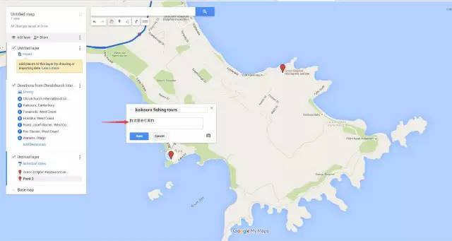 接着说回到谷歌地图。刚才创建的是第一个图层,是整体的旅行线路规划。在具体的每一个城市,还可以创建多个图层,来更好的管理线路和行程。具体操作如下:点击左上方红框里的Add Layer,左侧多出来的Untitled layer处点击一下,再在地图上输入Green Dolphin Restruant, 点击add to map.