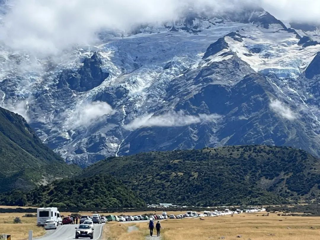 库克山国家公园内的白马营地(White Horse Hill Campground)停车场每天爆满!以至于游客不得不把车停在胡克路 (Hooker Valley Rd) 两侧,延伸长度长达1.5公里,场面十分壮观。
