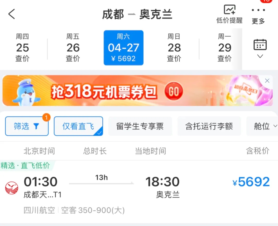 但是由于这个航班主要是旅游路线乘客,新西兰春节旺季一过,航班上座率便下降了,南航便取消了近期的航班。不过不用担心,目前已经能够查询到10.28起,该航线就复飞了,并且每周同样有3-5天有该航线。